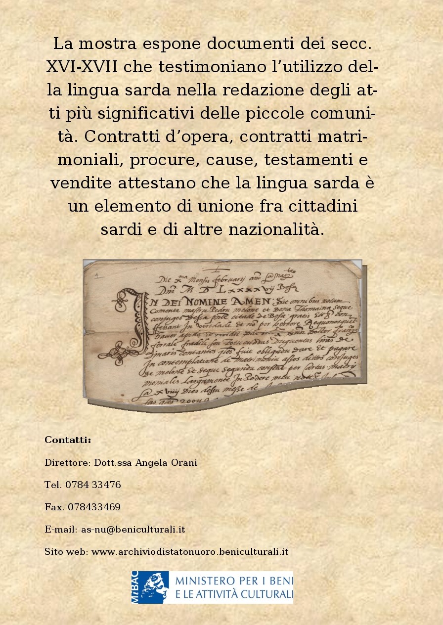 La mostra espone documenti dei secc. XVI – XVII che testimoniano l’utilizzo della lingua sarda nella redazione degli atti più significativi delle piccole comunità. Contratti d’opera, contratti matrimoniali, procure, cause, testamenti e vendite attestano che la lingua sarda è un elemento di unione fra cittadini sardi e di altre nazionalità.