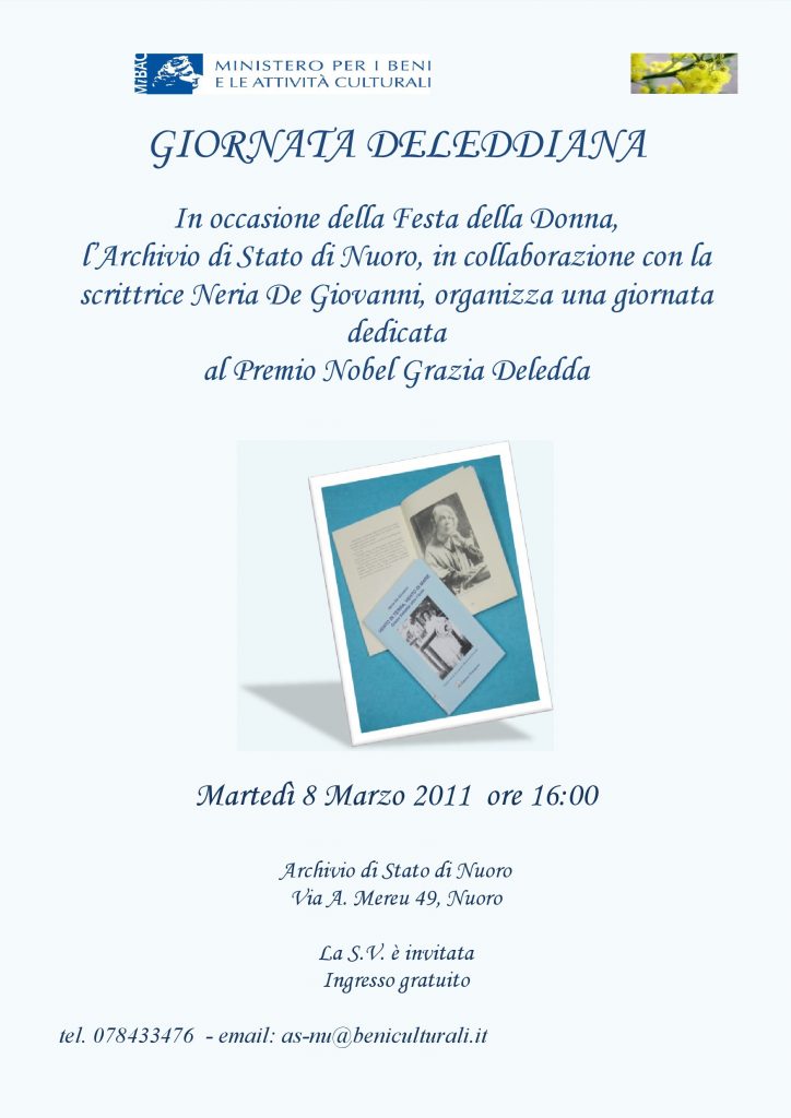 L’Archivio di Stato di Nuoro organizza per l’ 8 Marzo, in collaborazione con la scrittrice e critica letteraria Neria De Giovanni, una giornata interamente dedicata al Premio Nobel Grazia Deledda.