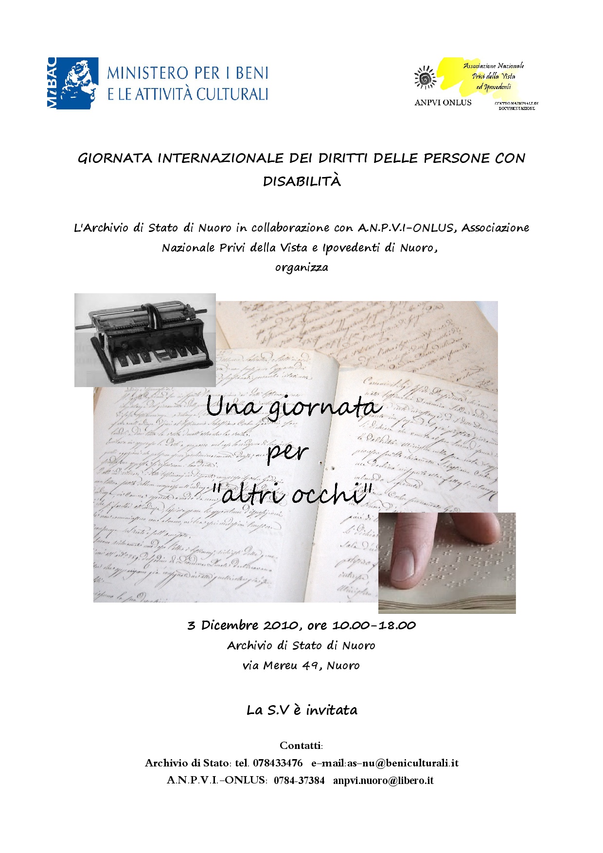 L’Archivio di Stato , in collaborazione con l’A.N.P.V.I.-ONLUS, Associazione Nazione Privi della Vista e Ipovedenti di Nuoro, ospiterà per l’intera giornata del 3 Dicembre una sezione di utenti privi della vista e ipovedenti, che con sintetizzatori vocali e barre braille, faranno “parlare” il patrimonio documentario a loro negato.