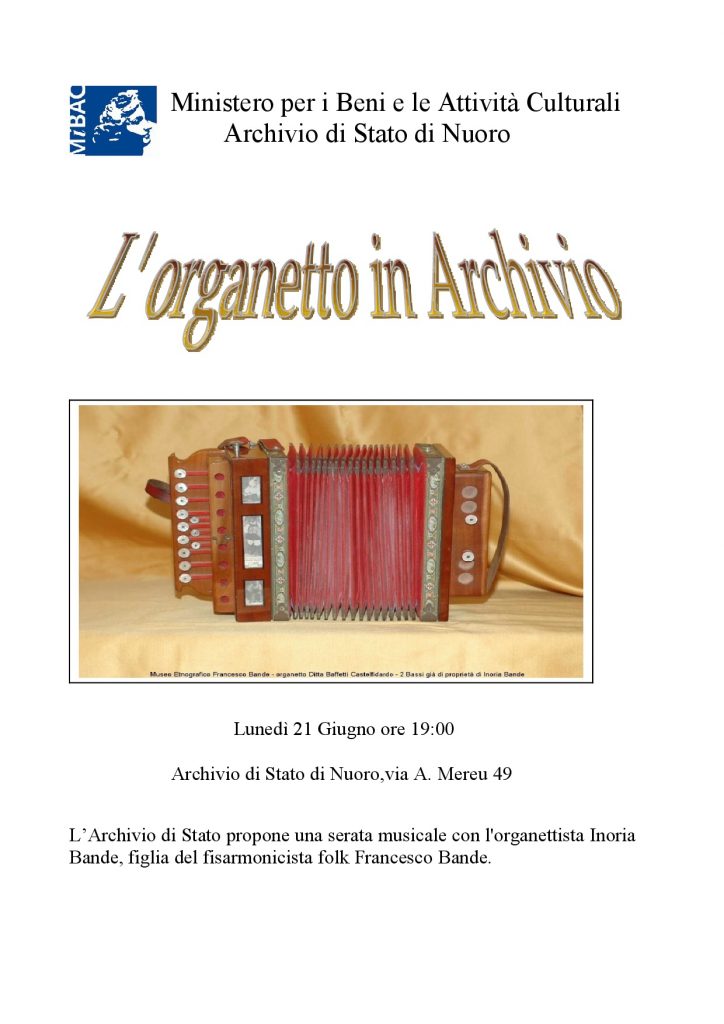 L’ Archivio di Stato di Nuoro intende offrire al pubblico una serata musicale con l’organettista Inoria Bande, figlia del fisarmonicista folk Francesco Bande.