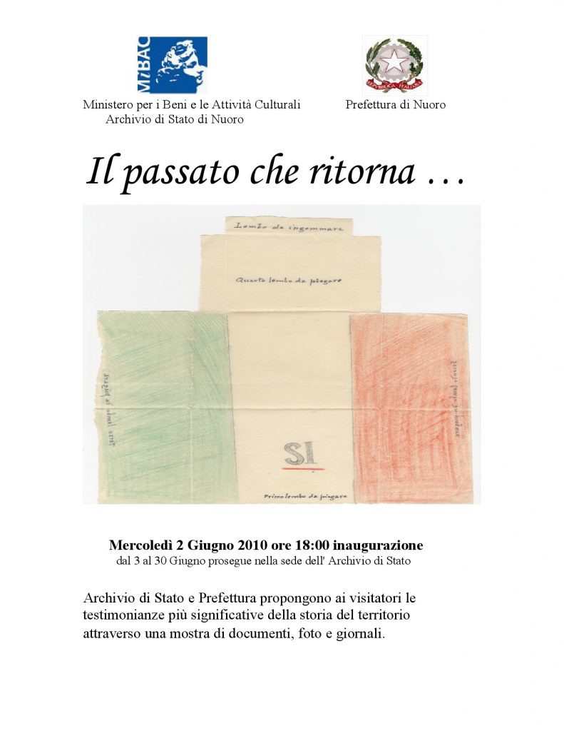 In occasione del 64° anniversario della proclamazione della Repubblica italiana l’Archivio di Stato e la Prefettura di Nuoro propongono ai visitatori le testimonianze più significative della storia del territorio attraverso una mostra di documenti, foto e giornali.