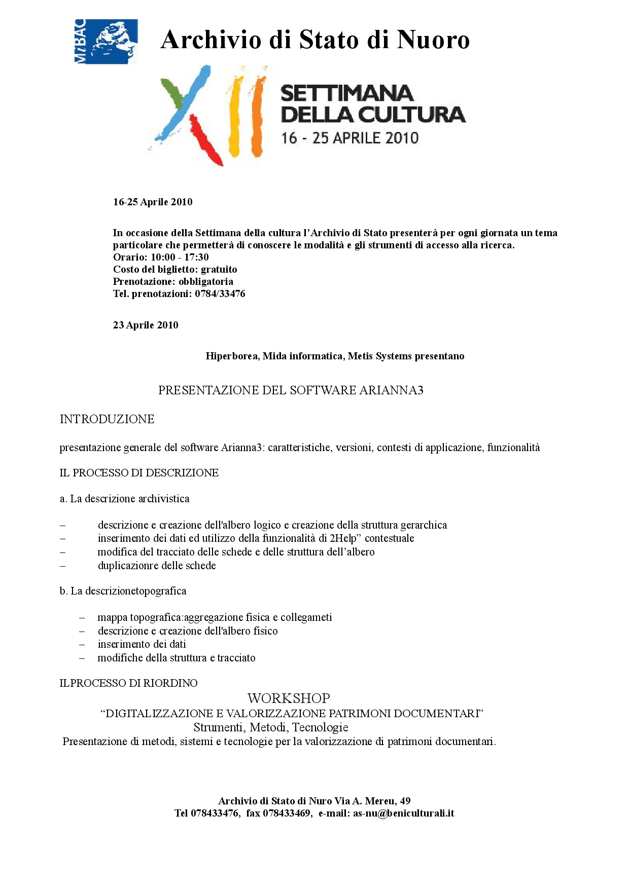 In occasione della Settimana della cultura l’Archivio di Stato presenterà per ogni giornata un tema particolare che permetterà di conoscere le modalità e gli strumenti di accesso alla ricerca. La giornata del 23 Aprile sarà interamente dedicata alla presentazione del Workshop “Digitalizzare e valorizzare patrimoni documentari, strumenti, metodi, tecnologie” e del Software “Arianna3” realizzati da Hyperborea, Mida Informatica, Metis Systems.