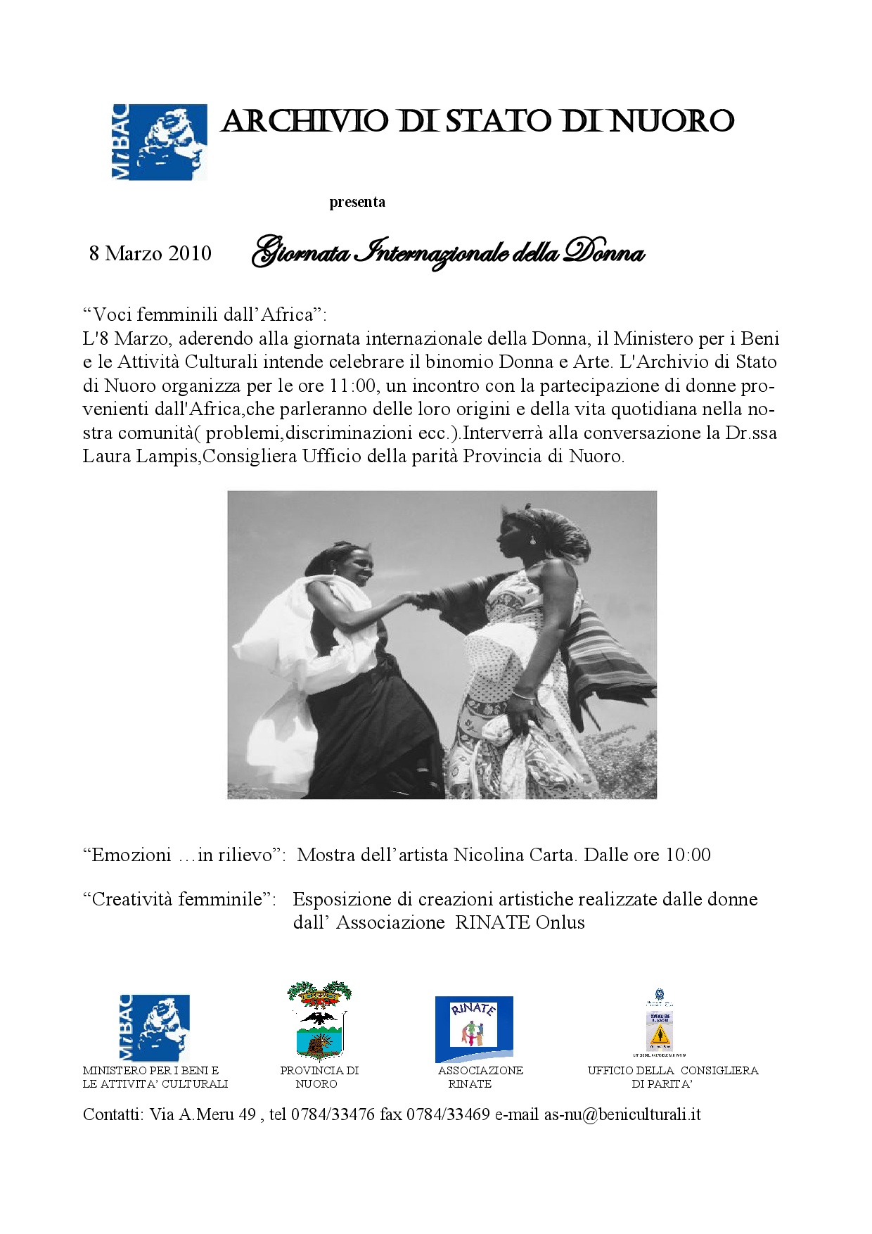 Il giorno 8 Marzo, aderendo alla giornata internazionale della Donna, il Ministero per i Beni e le Attività Culturali intende celebrare il binomio Donna e Arte. L’Archivio di Stato di Nuoro organizza per le ore 11:00, un incontro con la partecipazione di donne provenienti dall’Africa, che parleranno delle loro origini e della vita quotidiana nella nostra comunità( problemi, discriminazioni ecc.). Interverrà alla conversazione la Dr.ssa Laura Lampis, Consigliera Ufficio della parità Provincia di Nuoro.