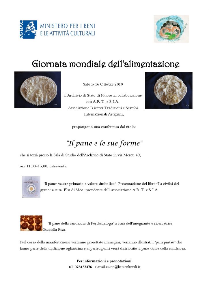 Nell’ambito della Giornata Mondiale dell’Alimentazione e in collaborazione con A.R.T. e S.I.A. si terrà una conferenza sul significato del grano e del pane nella cultura sarda. Con la mostra si portano al pubblico alcuni pani tradizionali di cui si è mantenuta viva la straordinaria abilità della lavorazione.